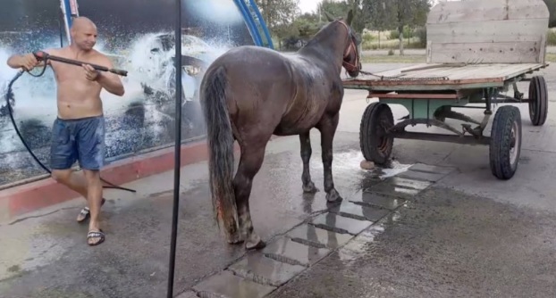 VIDEO A dus calul la o spălătorie auto pentru a-l răcori. Imagini virale din Timiş