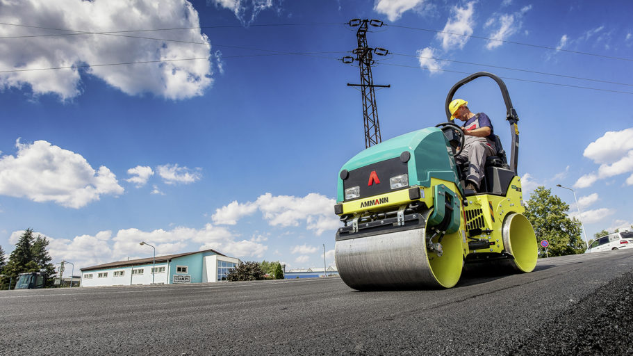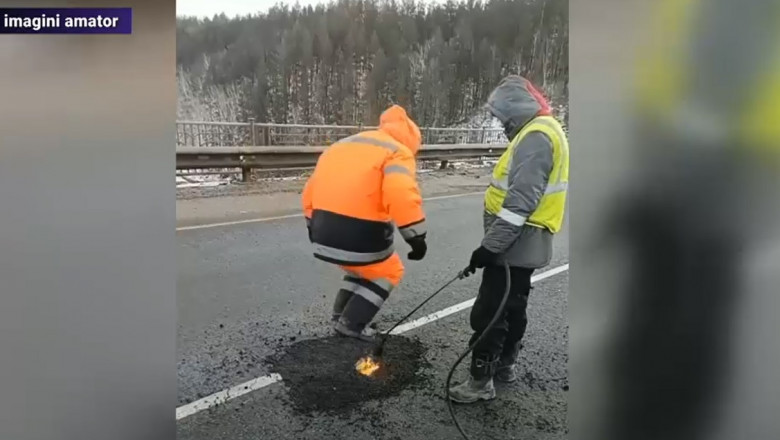 Doi muncitori asfaltează un drum cu picioarele. La propriu....