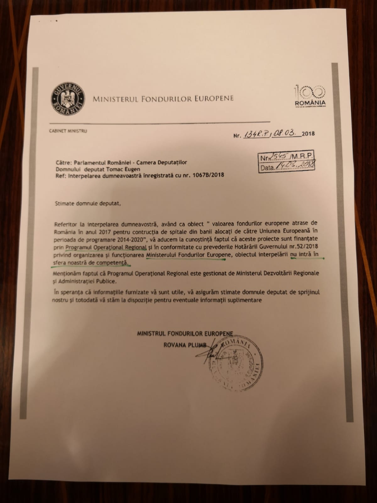 - România crește sănătos, 800 de milioane de euro pentru sectorul sănătate, prin intermedul a patru programe operaționale . PMP a solocitat la începutul anului de la Rovana Plumb, ministrul fondurilor europene, date în legătură cu absorbția fondurilor europene pentru construcția de spitale din bani alocați de către UE. Răspunsul a fost primit pe 14 martie 2018: nu intră în competența ministrului fondurilor europene atragerea de fonduri europene pentru construcția de spitale, ci este în atribuția mnistrului dezvoltării;