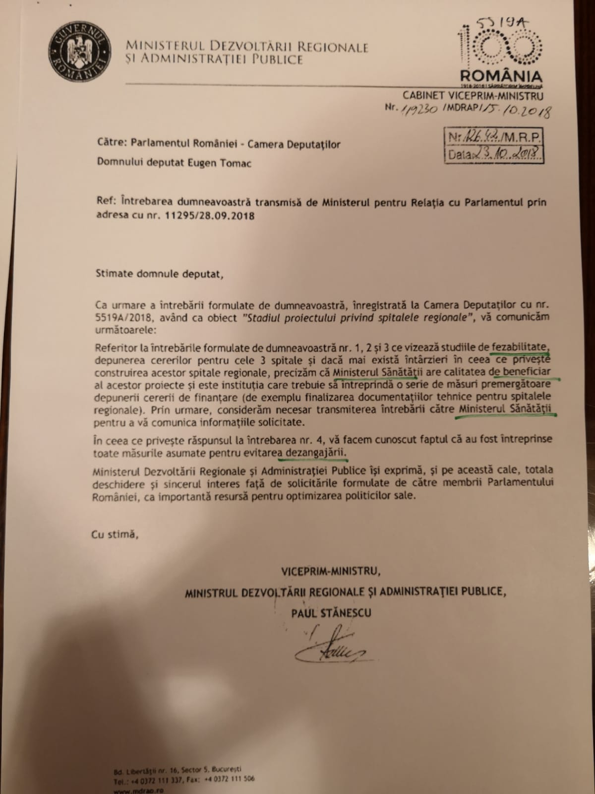 - solicitare a PMP către Paul Stănescu cu privire la oferirea de date exacte pentru construcția de spitale. Răspunsul a fost primit în mai 2018 : se are în vedere accelerarea procesului de îmbunătățirea a procedurilor cu privire la atragere de fonduri europene, dar responsabilitatea pentru gestionarea proiectului revine ministerului sănătății;
