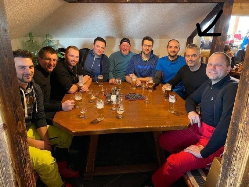 În fotografie, Nehammer şi colegii săi de schi nu poartă mască. Poza a fost făcută la 29 decembrie, într-o cabană de pe domeniul Katschberg şi postată pe reţelele de socializare.