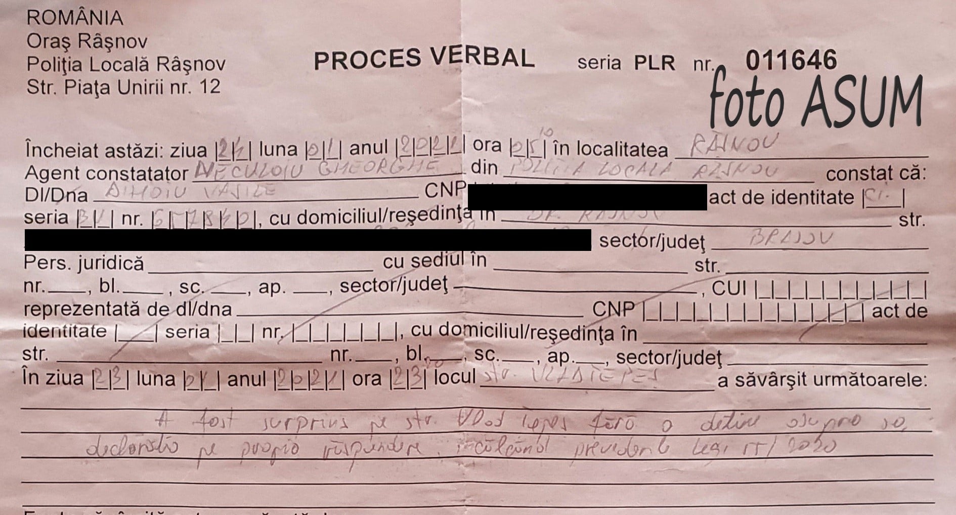 Asociaţia pentru SIguranţă Urbană şi Mediere (ASUM) Braşov a publicat un procesul-verbal pe care un poliţist local l-a întocmit pe numele bărbatului mort şi care se plimba pe stradă după ora 23:00.