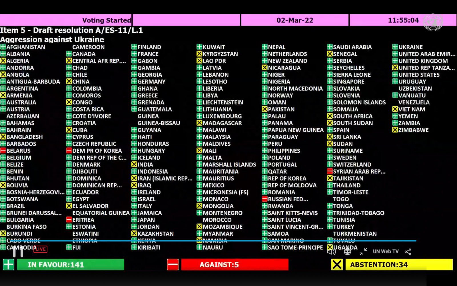În favoarea proiectului de condamnare a invaziei militare ruse au votat 141 de state, iar cinci ţări – Rusia, Belarus, Coreea de Nord, Eritreea şi Siria – s-au pronunţat împotriva rezoluţiei, conform cotidianului Le Figaro. Reprezentanţii a 35 de ţări, inclusiv ambasadorul Chinei, s-au abţinut de la vot.