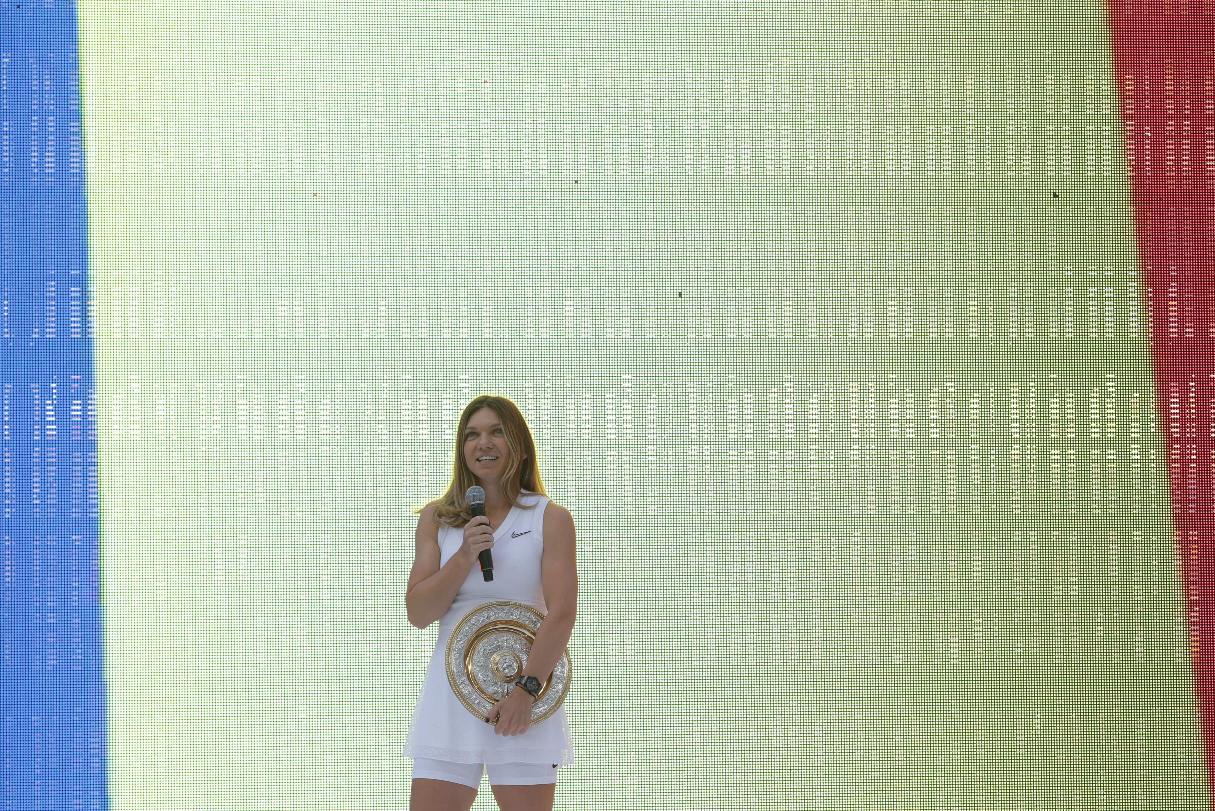 Jucătoarea de tenis Simona Halep, numărul 4 în clasamentul WTA, a prezentat trofeul câştigat la turneul de la Wimbledon, al doilea de Mare Şlem din carieră după Roland Garros, miercuri seara, în cadrul unei ceremonii organizate pe Arena Naţională din Capitală la care au participat aproximativ 20.000 de bucureşteni.