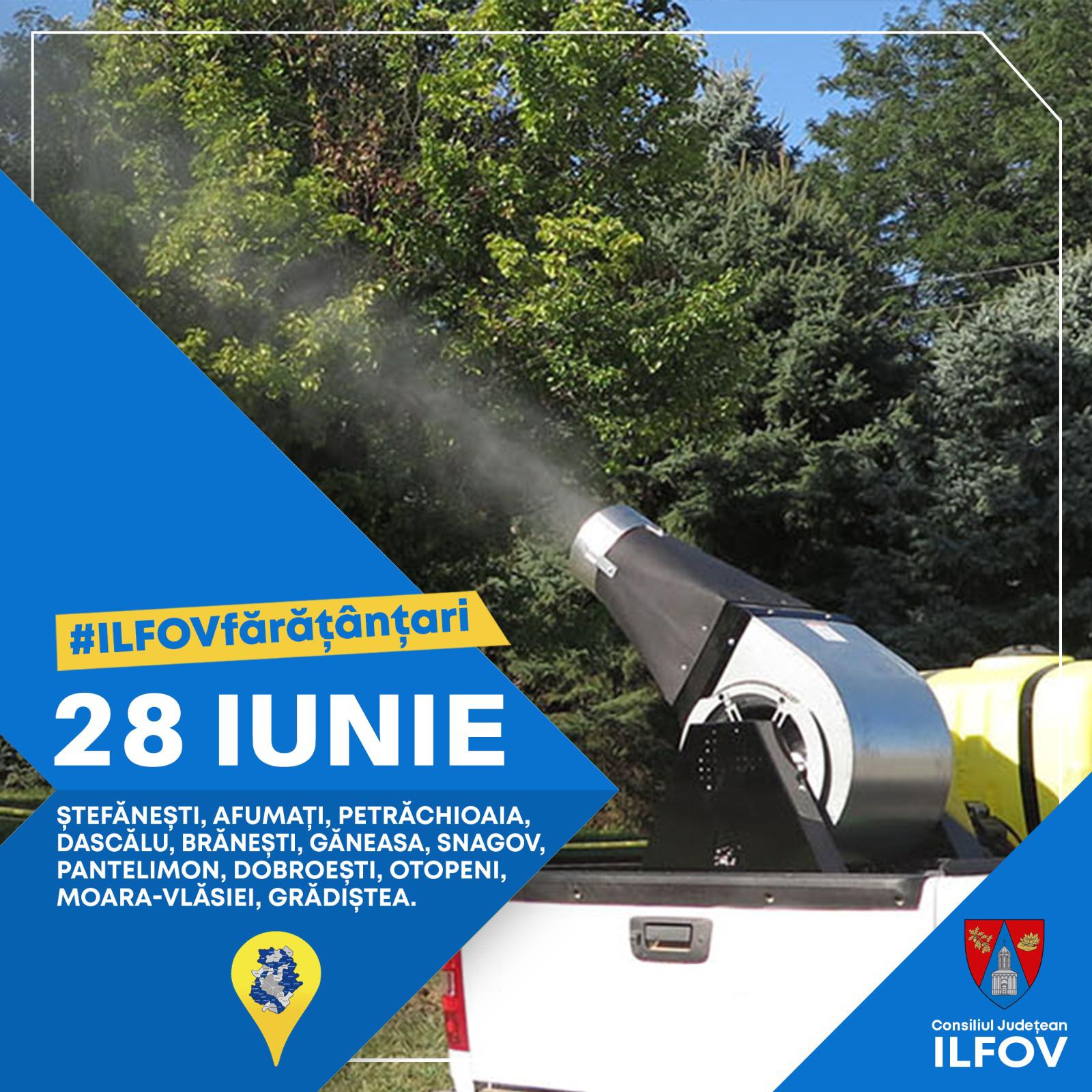 Serviciul Județean de Dezinsecție și Ecologizare Mediu Ilfov continuă campania pentru combaterea insectelor de disconfort (țânțari adulți), în funcție de condițiile meteo, în perioada 𝟮𝟳 – 𝟯𝟬 𝗶𝘂𝗻𝗶𝗲 𝟮𝟬𝟮𝟮, începând cu 𝟮𝟮:𝟬𝟬, prin tratament terestru, în interiorul localităților: