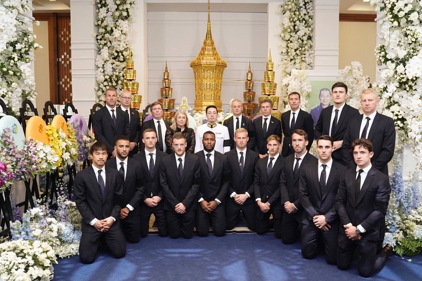 Fotbaliştii şi antrenorul, îmbrăcaţi în costume negre, i-au adus un omagiu lui Vichai Srivaddhanaprabha la un templu din Bangkok.