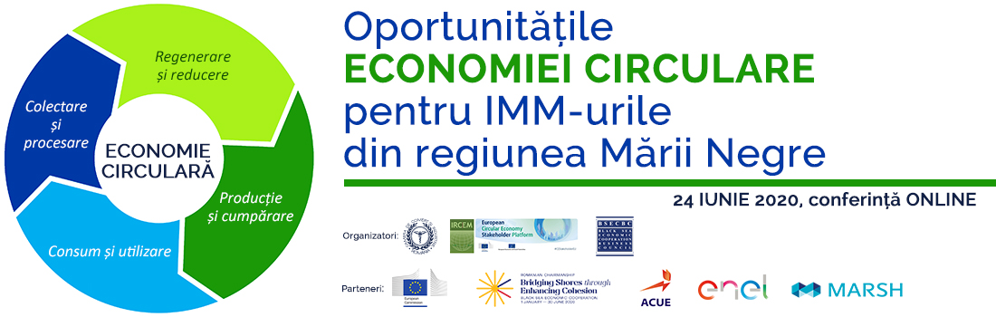 Camera de Comerț și Industrie a României (CCIR), care deține Președinția-în-Exercițiu a Consiliului de Afaceri al Organizației pentru Cooperare Economică la Marea Neagră, împreună cu Institutul de Economie Circulară și Mediu “Ernest Lupan” și în parteneriat cu Reprezentanța Comisiei Europene în România, Ministerul Afacerilor Externe și Federația Asociațiilor Companiilor de Utilități din Energie, Enel România și Marsh România au plăcerea de a vă invita să participați la conferința Oportunitățile economiei circulare pentru IMM-urile din regiunea Mării Negre, care se va desfășura în format digital, pe platforma MyConnector, în data de 24 iunie 2020.