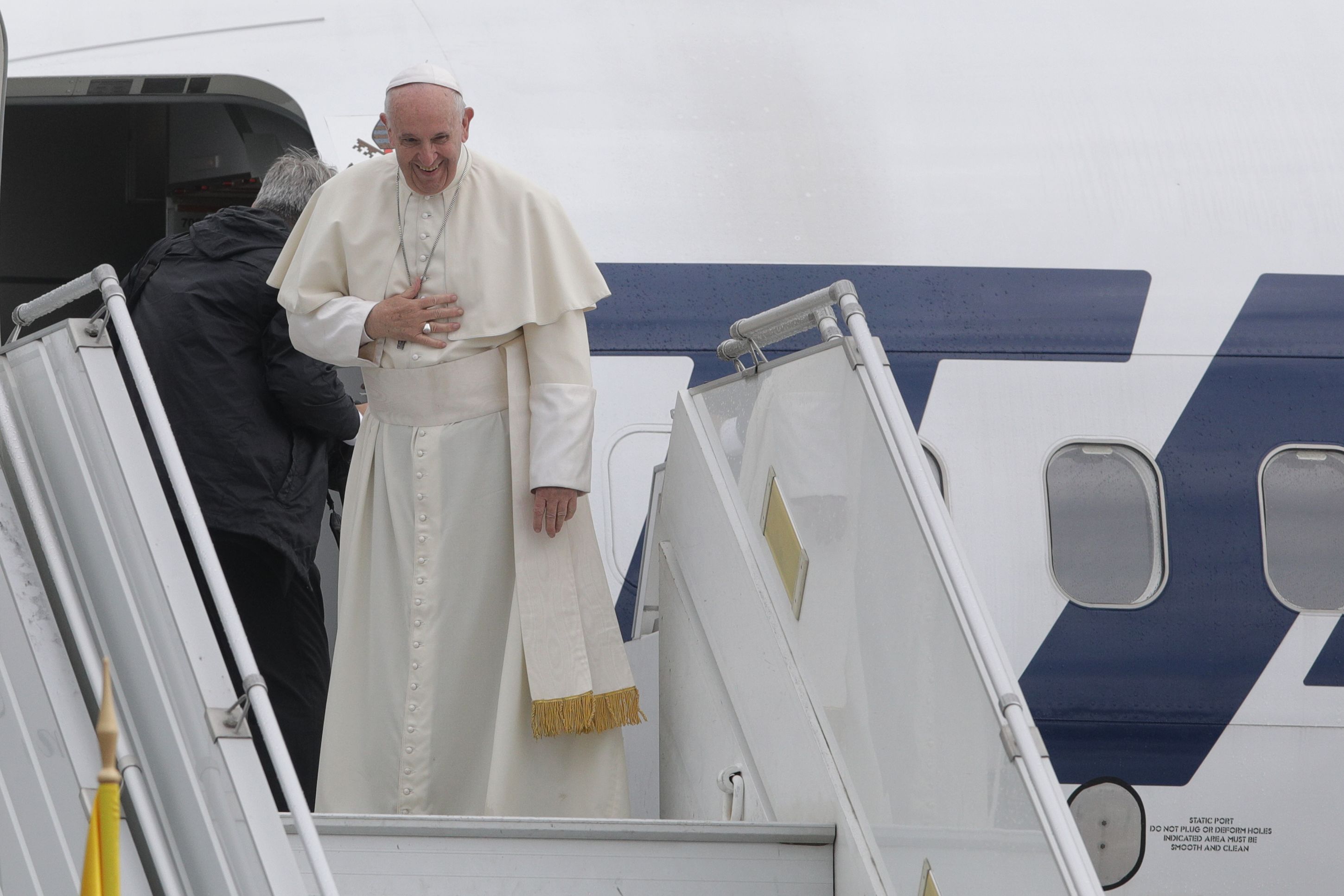 La aeroportul din Sibiu, Sanctitatea Sa a fost aşteptat de preşedintele Klaus Ioahnnis şi de soţia sa, Carmen Iohannis, dar şi de peste 2.000 de persoane. Papa Francisc a salutat, pe rând, mulţimea la plecare, evitând practic covorul roşu până la aeronavă, oamenii aplaudând şi strigând „Vivat Papa”.