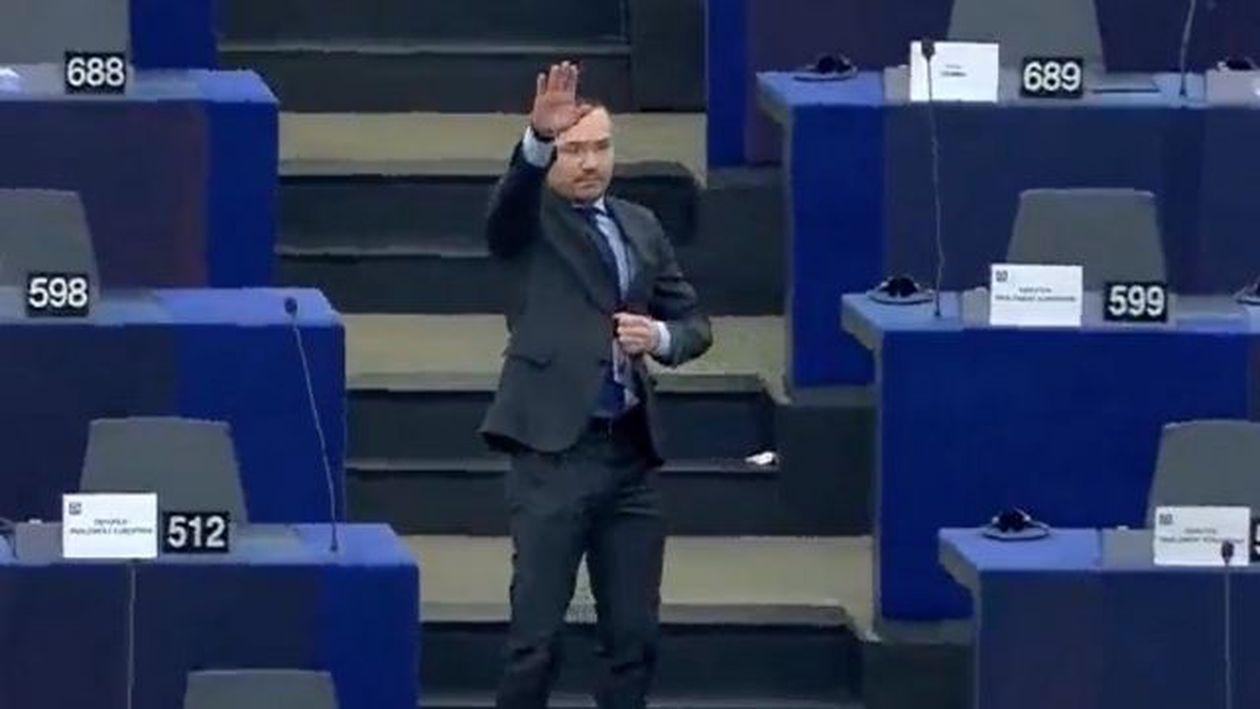 Europarlamentarul Angel Dzhambazki, de la partidul de extremă dreaptă VMRO-Mișcarea Națională Bulgară, a făcut gestul după ce și-a încheiat discursul, în cadrul dezbaterii Parlamentului European despre statul de drept. Discuția a avut loc în contextul sancțiunilor împotriva Poloniei și Ungariei.